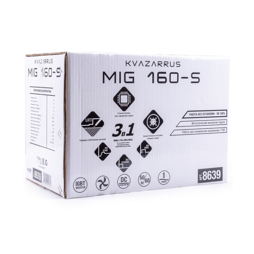 Сварочный полуавтомат инверторного типа FOXWELD KVAZARRUS MIG 160-S с синергетическим управлением предназначен для полуавтоматической сварки в среде инертных и активных газов с использованием самозащитной проволоки в режиме MIG, а также для дуговой сварки штучным электродом в режиме ММА, и аргонодуговой сварки вольфрамовым электродом при помощи вентильной горелки (TIG LIFT). KVAZARRUS MIG 160-S применяется для использования в быту: в производстве стальных конструкций, для выполнения кузовного ремонта автомобилей и т.п. Управление параметрами сварки за счет "умных" предустановок синергетического меню облегчают настройку сварочного аппарата одной кнопкой.СИНЕРГЕТИЧЕСКИЙ РЕЖИМ УПРАВЛЕНИЯ: Режим синергетики позволяет сэкономить время и получить качественное сварное соединение даже новичку, так как основные параметры подбираются автоматически с возможностью тонкой ручной подстройки сварочного процесса. Синергетику можно отключить для работы в ручном режиме. Синергетику можно отключить для работы в ручном режиме.МНОГОФУНКЦИОНАЛЬНОСТЬ 3-В-1: Благодаря своей многофункциональности и возможности переключения 3 режимов сварки, аппарат позволяет проводить следующие виды работ: полуавтоматическую сварку (MIG/MAG) сплошной проволокой в среде защитного газа и самозащитной проволокой без использования защитного газа, ручную дуговую сварку (ММА) на постоянном токе штучным электродом с рутиловым и основным покрытием, аргонодуговую сварку (TIG LIFT) на постоянном токе с возбуждением дуги касанием вольфрамового электрода.РАБОТА ПРИ ПОНИЖЕННОМ НАПРЯЖЕНИИ: Сварочные аппараты инверторного типа с транзисторами IGBT (Insulated Gate Bipolar Transistor) сохраняют работоспособность при отклонениях напряжения в пределах 220 В ±15%, что позволяет продолжить работу при пониженном и нестабильном напряжении электрической сети.РУЧНАЯ КОРРЕКТИРОВКА ДЛИНЫ ДУГИ: Функция корректировки длины дуги позволяет изменять вручную напряжение в процессе сварки. Это даёт возможность компенсировать потери сварочного напряжения, например, из-за слишком длинного кабеля. Также с помощью ручной регулировки можно усилить сварной шов, изменить его форму – сделать более пологим или повысить растекаемость.ПРЕИМУЩЕСТВА:Работа на малых токах (для сварки изделий небольших толщин)Работа при пониженном напряженииСинергетический подбор режимов для быстрой настройки аппаратаРучная дуговая сварка штучным покрытым электродом (ММА) на постоянном токеАргонодуговая сварка (TIG LIFT) на постоянном токеЛёгкое переключение полярности при полуавтоматической сварке для использования самозащитной проволоки (FLUX)Hot Start, Arc Force и Antisticking в режиме ММА сваркиМеталлический механизм подачи проволоки2 цифровых дисплея для отображения основных параметровРегулировка напряжения для тонкой настройки сварочного процессаФУНКЦИОНАЛЬНЫЕ ОСОБЕННОСТИ:ИНВЕРТОР НА ТРАНЗИСТОРАХ IGBT: Сварочные аппараты с технологией IGBT (Insulated Gate Bipolar Transistor) имеют следующие преимущества: высокое номинальное напряжение, небольшую мощность управления и высокую скорость переключения.РЕЖИМ TIG LIFT: Аргонодуговая сварка вольфрамовым электродом при помощи TIG горелки подходит для работы в условиях повышенной влажности.НЕБОЛЬШОЙ ВЕС: Небольшой вес и размеры сварочного аппарата плюс ручка на корпусе добавляют мобильности, компактности и идеально подходят д