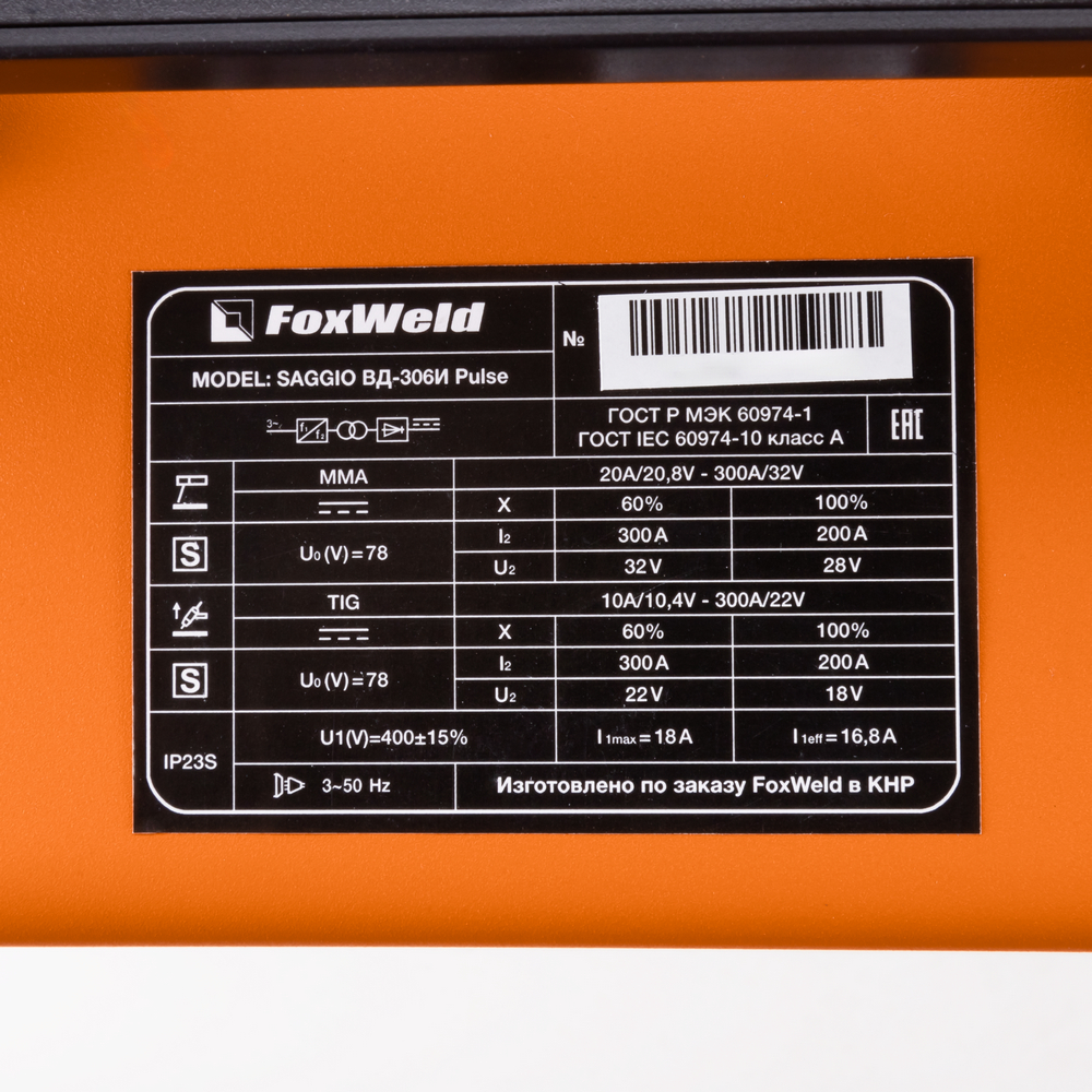 Сварочный инвертор SAGGIO ВД-306И Pulse – компактный профессиональный трёхфазный аппарат для ручной дуговой сварки (MMA) с дополнительным режимом аргонодуговой сварки TIG LIFT и импульсными режимами MMA PULSE, TIG LIFT PULSE. Аппарат предназначен для сварки изделий из нержавеющей и низкоуглеродистой стали. Импульсные режимы предотвращают вероятность прожога и деформации металла в случае длительных сварочных работ. Панель управления аппарата улучшена за счёт наглядной циклограммы и кнопок переключения процессов и параметров сварки. Регулируемые функции Arc Force (форсаж дуги), Нot Start (горячий старт), отключаемая функция VRD (снижение напряжения холостого хода) обеспечивают удобство и безопасность во время сварки. Разъём ДУ позволяет подключить пульт дистанционного управления аппаратом.РЕЖИМ PULSE: Режим PULSE упрощает процесс сварки, обеспечивая высокий уровень надёжности соединения. В отличие от короткого замыкания, импульсная сварка не создает брызг и предотвращает залипание. Качество и удобство импульсного процесса позволяет сваривать швы разной сложности сварщику с незначительным опытом.ЦИКЛОГРАММА КОНТРОЛЯ ПАРАМЕТРОВ: Информативная циклограмма с кнопкой переключения параметров на передней панели аппарата обеспечивает удобную и точную настройку режимов, а также позволяет осуществить полный контроль над рабочими процессами.ИНТЕЛЛЕКТУАЛЬНОЕ ОХЛАЖДЕНИЕ: Скорость вращения вентилятора воздушной системы охлаждения регулируется автоматически в зависимости от выбранного сварочного процесса и тока сварки, что уменьшает шум во время работы, а также минимизирует попадание пыли внутрь аппарата.РАЗЪЁМ ДУ: Возможность подключения пульта дистанционного управления позволяет регулировать сварочный ток непосредственно вблизи проведения сварочных работ даже при большой длине сварочных кабелей.СНИЖЕНИЕ НАПРЯЖЕНИЯ ХОЛОСТОГО ХОДА: VRD (снижение напряжения холостого хода) повышает безопасность и исключает риск поражения сварщика электрическим током. Сварочный процесс становится более безопасным в замкнутых пространствах и при сварке в условиях повышенной влажности.ПРЕИМУЩЕСТВА:Многофункциональность – MMA, TIG LIFT, MMA PULSE, TIG LIFT PULSEСпециальные функции Antisticking (Антизалипание), Hot Start (Горячий старт), Arc Force (Форсаж дуги)Трёхфазное питание от 400 вольт – даже при максимальном сварочном токе вся нагрузка равномерно распределяется на 3 линии производственной площадкиПринцип тоннельной вентиляции - максимальная защита от пыли и грязиОхлаждение силовых элементов осуществляется эффективным и мощным вентиляторомПромышленное исполнение, максимальная степень надёжности компонентов и электронных элементовМощный и надёжный корпус с удобной ручкой для перемещенияЗащитная крышка панели управленияФУНКЦИОНАЛЬНЫЕ ОСОБЕННОСТИ:ФУНКЦИЯ BALANCE AC: Возможность регулировки времени и амплитуды сварочного сигнала в положительной или отрицательной полярности. Данная функция обеспечивает отличный контроль проплавления и чистоты дуги со значительным сокращением боковых подрезов металла.РЕЖИМ TIG LIFT: Сварочный ток от 10 до 300 ампер позволяет осуществлять сварку неплавящимся вольфрамовым электродом деталей любой толщины;Максимальный ток в 300 А, выдаваемый источником питания, позволяет применять вольфрамовые электроды диаметрами от 1,0 до 3,2 мм;Мягкий и стабильный конта