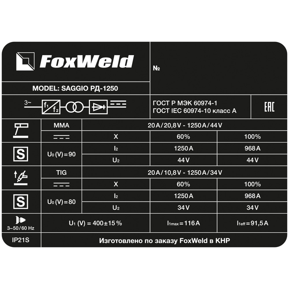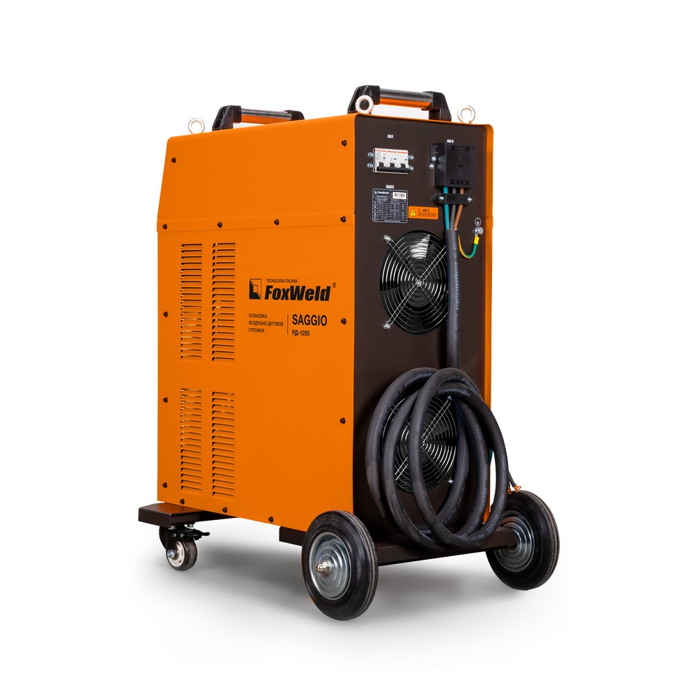 SAGGIO РД-1250 – многофункциональная трёхфазная установка инверторного типа, предназначенная для воздушно-дуговой строжки (ARC AIR), ручной дуговой сварки (ММА), а также аргонодуговой сварки на постоянном токе (TIG LIFT). Ручки регулировки сварочного тока и встроенных функций Arc Force (форсаж дуги) и Hot Start (горячий старт) на панели управления позволяют легко настроить установку под конкретные задачи. Функция VRD (снижение напряжения холостого хода) повышает безопасность и исключает риск поражения сварщика электрическим током. К аппарату можно подключить пульт дистанционного управления, который идёт в комплекте. SAGGIO РД-1250 оборудован тележкой на колёсах.МНОГОФУНКЦИОНАЛЬНОСТЬ 3-В-1: Установка воздушно-дуговой строжки может работать в трёх режимах: воздушно-дуговой строжки (ARC AIR), ручной дуговой сварки (ММА), а также аргонодуговой сварки на постоянном токе (TIG LIFT).ВЫСОКАЯ ПРОИЗВОДИТЕЛЬНОСТЬ: Большой сварочный ток, ПВ 60% на максимальном токе, мощная установка с максимальным сварочным током 1250 А, КПД 85% — всё это обеспечивает эффективность и повышает производительность сварочного процесса.СНИЖЕНИЕ НАПРЯЖЕНИЯ ХОЛОСТОГО ХОДА: Функция VRD (снижение напряжения холостого хода) повышает безопасность и исключает риск поражения сварщика электрическим током. Сварочный процесс становится более безопасным в замкнутых пространствах и при сварке в условиях повышенной влажности.ПУЛЬТ ДУ: К установке можно подключить пульт дистанционного управления (идёт в комплекте), что позволяет регулировать сварочный ток непосредственно вблизи проведения сварочных работ, создавая условия для получения максимального качества сварного шва.ПОДКЛЮЧЕНИЕ 400 В: Подключение к трёхфазной сети питания 400 вольт увеличивает эффективность установки воздушно-дуговой строжки (сварочный ток, расход электроэнергии).ПРЕИМУЩЕСТВА:Большой сварочный токЦифровой дисплейРегулируемая функция Горячий стартРегулируемая функция Форсаж дугиФункция АнтизалипаниеПлавная регулировка сварочного токаРежим TIG LIFTФункция VRDИнвертор на транзисторах IGBTУдобная эксплуатацияУвеличенный срок службыКОМПЛЕКТАЦИЯ: Установка воздушно-дуговой строжки SAGGIO РД-1250 – 1 шт.; Сетевой кабель 3,5 м (3х16+1х1) – 1 шт.; Клемма заземления типа струбцина – 1 шт.; Обратный кабель 70 мм², 8 м – 2 шт.; Пульт дистанционного управления – 1 шт.; Комплект платформы с 4-мя колёсами и болтами – 1 шт.; Инструкция по эксплуатации + Гарантийный талон – 1 компл.*Производитель оставляет за собой право вносить изменения в комплектацию оборудования без предварительного уведомления покупателя.