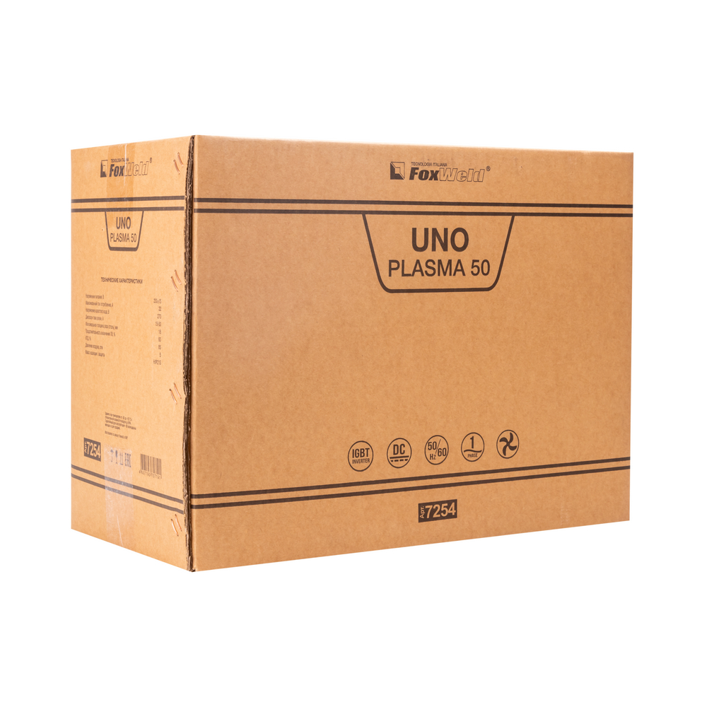 Аппарат плазменной резки FOXWELD UNO PLASMA 50 позволяет разрезать сталь толщиной до 18 мм. UNO PLASMA 50 подходит для резки алюминиевых сплавов, меди, цветных металлов, нержавеющей и углеродистой стали. Высокие динамические характеристики дуги, регулировка и точность установки тока, инверторная технология обеспечивают качество реза и экономию энергии. Встроенный манометр позволяет следить за значениями давления сжатого воздуха в процессе работы и при постпродувке плазмотрона. Небольшой вес и размеры аппарата, наличие ручки на корпусе идеально подходят для бытового и полупрофессионального использования.ФИГУРНАЯ РЕЗКАОсновное преимущество плазменной резки – возможность прорезать металл под разными углами, выполнять прямые и криволинейные резы и делать отверстия сложной формы. С помощью плазмотрона, выдающего струю плазмы, вырезать из металла и сплавов различные фигуры намного удобнее и быстрее по сравнению с УШМ.БЕЗОПАСНОСТЬ РАБОЧЕГО ПРОЦЕССАПлазменная резка намного безопаснее и экологичнее газовой резки. Источник питания, плазмотрон и компрессор (иногда встроенный в аппарат) – вот всё, что нужно для начала работы. Отсутствие взрывоопасности (никаких баллонов с газом) и загрязнения окружающей среды из-за метода сжигания топлива выгодно отличает плазменную резку от газовой.ВЫСОКАЯ ПРОИЗВОДИТЕЛЬНОСТЬПроцесс плазменной резки – это быстрый и простой способ резки металла и сплавов, который даёт качественный результат. Плазменная резка в несколько раз быстрее газовой. А качество реза достигается за счёт отсутствия тепловой деформации при выдувании излишек расплава и локального нагрева.ТОЛЩИНА РЕЗА ДО 18 ММБлагодаря высоким динамическим характеристикам дуги и стабильному току резки аппарат способен разрезать металл толщиной до 18 мм.НЕБОЛЬШОЙ ВЕСНебольшой вес и размеры аппарата плюс ручка на корпусе добавляют мобильности, компактности и идеально подходят для бытового и полупрофессионального использования.ПРЕИМУЩЕСТВА:Воздушное охлаждениеВстроенный манометрПродувка после резки для охлаждения плазмотронаНебольшой вес и размеры аппаратаЗащита от перегреваФУНКЦИОНАЛЬНЫЕ ОСОБЕННОСТИ:ВСТРОЕННЫЙ МАНОМЕТР: Встроенный манометр с индикатором на панели управления позволяет следить за значениями давления сжатого воздуха в процессе работы и при постпродувке плазмотрона.ЗАЩИТА ОТ ПЕРЕГРЕВА: Если аппарат работает непрерывно долгое время на большом токе, температура его внутренних компонентов может превысить допустимую. В этом случае загорается индикатор перегрева и включается режим термозащиты. При этом напряжение на выходных клеммах автоматически отключается, но вентилятор продолжает работать.ТАБЛИЦА ПОДБОРА КОМПРЕССОРОВ: В таблице ниже - рекомендации по подбору нужного компрессора.КОМПЛЕКТАЦИЯ: Аппарат плазменной резки UNO PLASMA 50 – 1 шт.; Плазмотрон PT-31, 3 м. – 1 шт.; Зажим для заземления с кабелем, 2 м. – 1 компл.; Рукав для подачи газа, 2 м. – 1 шт.; Узел подготовки воздуха (редуктор-осушитель) – 1 шт.; Комплект ЗИП – 1 шт.; Инструкция – 1 шт.; Гарантийный талон – 1 шт.