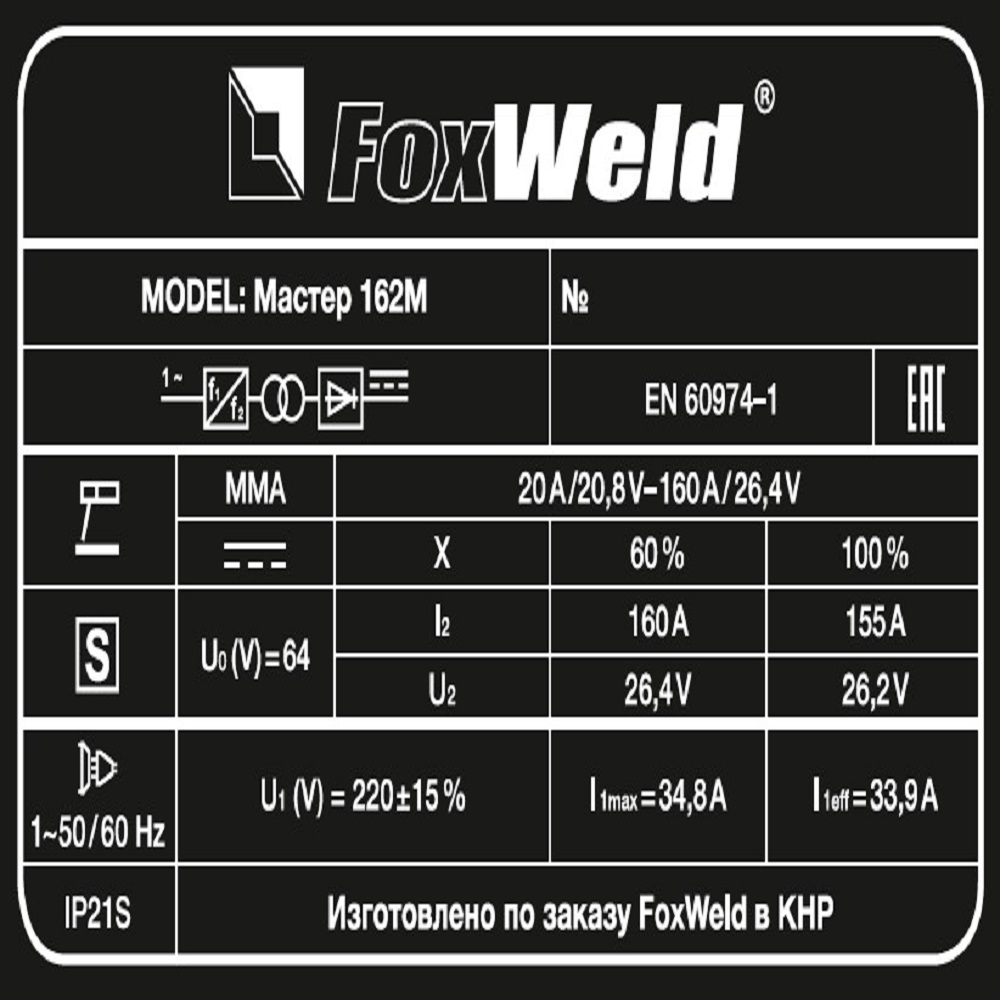 Сварочный аппарат инверторного типа FOXWELD Мастер 162М предназначен для ручной дуговой сварки на постоянном токе штучными электродами любого типа. Аппарат выполнен по новейшей технологии IGBT, позволяющей добиться минимального веса и компактных габаритов. Для облегчения работы сварщика и получения более качественного сварного соединения инвертор имеет встроенные функции Arc Force (Форсаж дуги), Hot Start (Горячий старт) и AntiSticking (Антизалипание). Инвертор выдает стабильный ток, отличается малым разбрызгиванием металла, позволяет проводить сварочные работы при пониженном напряжении в сети (возможно использование в сильно нагруженных электросетях, например, в зимний период, вариант «гаражное» напряжение или на больших удлинителях). Регулируемая функция форсажа дуги позволяет изменять вручную напряжение в процессе сварки, что даёт возможность компенсировать потери сварочного напряжения, например, из-за слишком длинного кабеля. Область применения — в бытовых условиях (на даче, в гараже), а также в небольших мастерских.РЕГУЛИРУЕМАЯ ФУНКЦИЯ ФОРСАЖ ДУГИ: Регулировка форсажа дуги позволяет изменять вручную напряжение в процессе сварки. Это даёт возможность компенсировать потери сварочного напряжения, например, из-за слишком длинного кабеля. Также с помощью ручной регулировки можно усилить сварной шов, изменить его форму – сделать более пологим или повысить растекаемость.РАБОТА ПРИ ПОНИЖЕННОМ НАПРЯЖЕНИИ: Аппарат работает от однофазной сети 220 В при перепадах напряжения от 140 до 270 В. Это даёт возможность производить сварочные работы в «плохих» сетях – на даче, в домашних условиях при пониженном или нестабильном напряжении.РАСШИРЕННАЯ КОМПЛЕКТАЦИЯ: Сетевой кабель, электрододержатель, зажим заземления – в комплекте есть всё для того, чтобы быстро приступить к работе.НЕБОЛЬШОЙ ВЕС: Небольшой вес и размеры сварочного аппарата плюс ручка на корпусе добавляют мобильности, компактности и идеально подходят для бытового и профессионального использования.ПРЕИМУЩЕСТВА:Очень простая и удобная панель управленияЦифровой дисплей для отображения величины сварочного токаВстроенные функции Hot Start, Antisticking и регулируемая Arc Force, облегчающие процесс сварки и способствующие получению более качественного сварного шва2 светодиода для контроля за работой сварочного источникаНебольшой и компактный сварочный инверторПитание от обычной сети 230 ВУверенно выдерживает пониженное и повышенное напряжение, работает при падении напряжения до 140 ВОдна из самых лучших систем стабилизации сварочного процесса и минимизации разбрызгивания за счёт улучшенной схемы управления сварочным процессомПлавная регулировка сварочного токаПолный комплект для начала сварочных работФУНКЦИОНАЛЬНЫЕ ОСОБЕННОСТИ:РЕЖИМ MMA: Работает с входным напряжением от 140 до 270 вольт;Может работать с диаметром покрытого электрода до 5 мм;Выставляется ток сварки от 20 до 160 ампер;Для облегчения процесса сварки присутствуют функции: Hot Start, Arc Force и AntistickingКОМПЛЕКТАЦИЯ: Сварочный аппарат FOXWELD Мастер 162М – 1 шт.; Зажим для заземления с кабелем – 1 компл.; Электрододержатель с кабелем – 1 компл.; Инструкция – 1 шт.; Гарантийный талон – 1 шт.