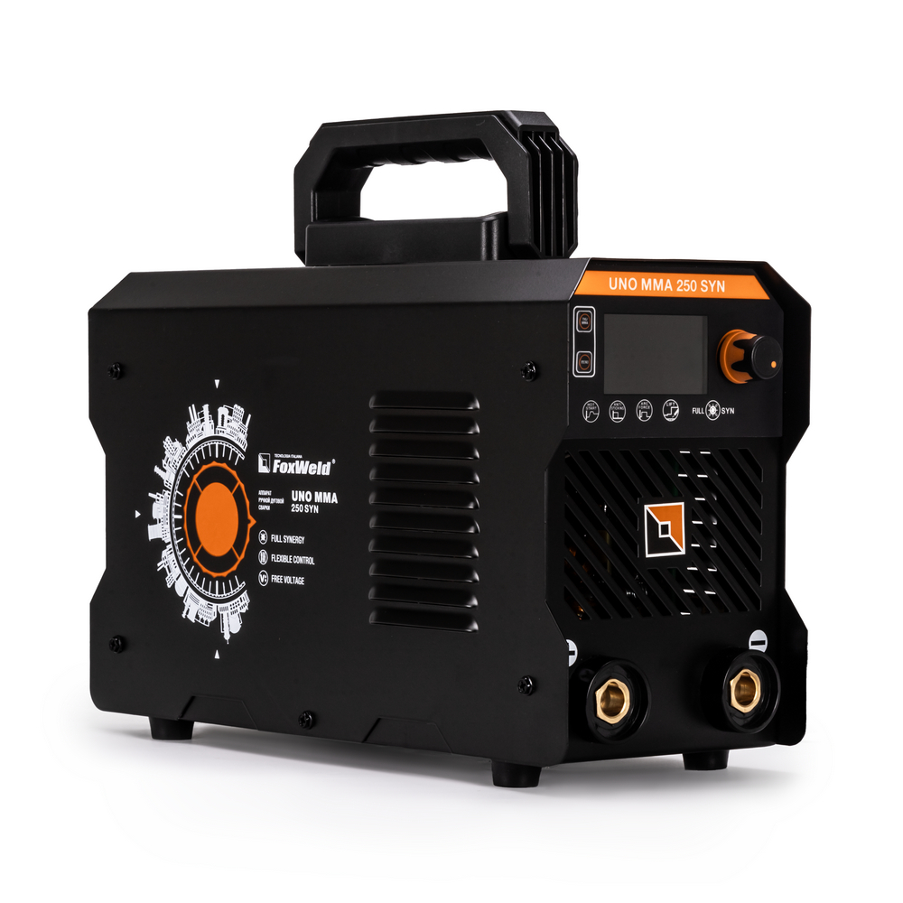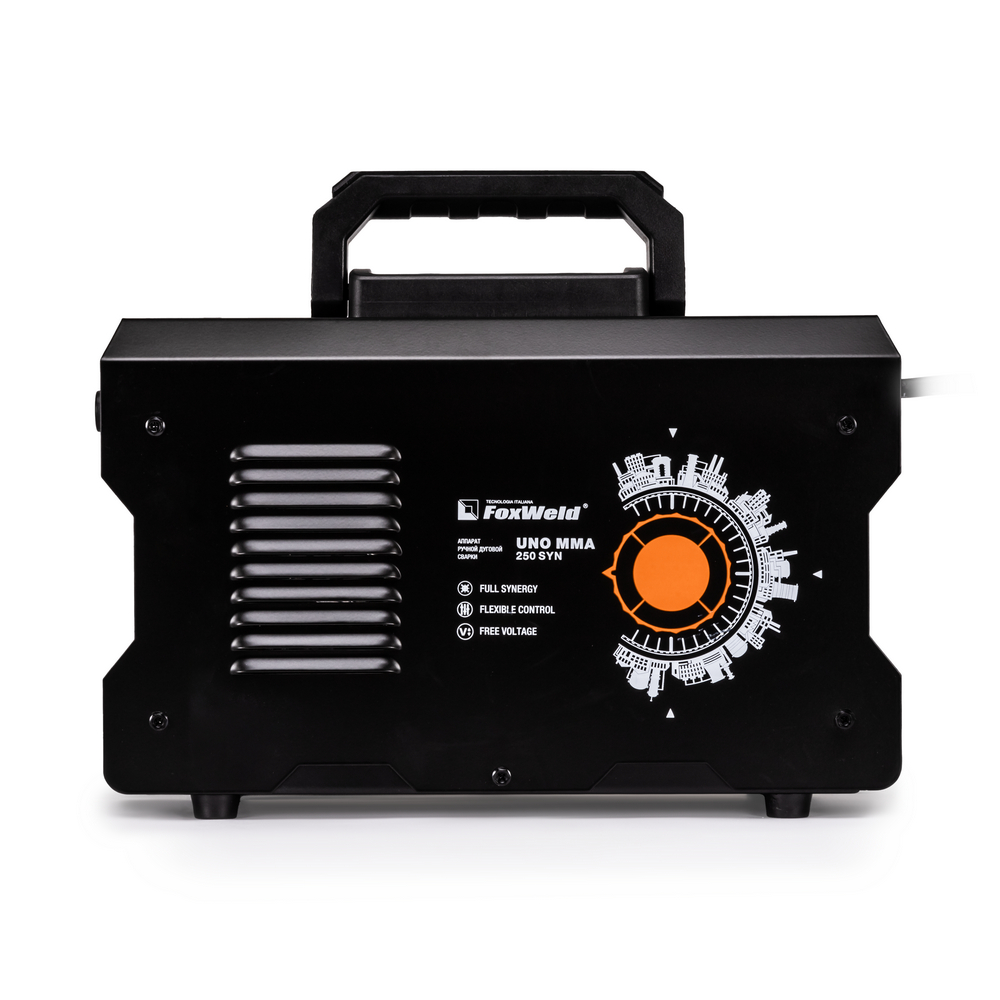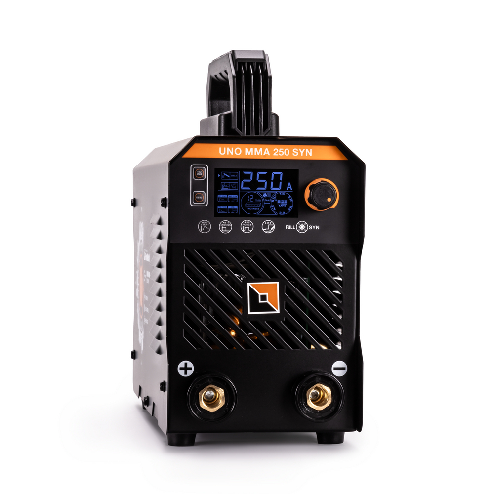 Сварочный аппарат UNO MMA 250 SYN c синергетическим управлением предназначен для ручной дуговой сварки (MMA) любыми типами электродов, а также для сварки вольфрамовыми электродами в среде инертного газа аргон (TIG LIFT). В модели есть полноценная синергетика, которая рекомендует соотношение параметра силы тока сварки к толщине свариваемого сплава металла. Для облегчения процесса сварки в режиме ММА и получения более качественного сварного соединения аппарат имеет регулируемые функции Нot Start (горячий старт) и Arc Force (форсаж дуги), а также AntiSticking (антиприваривание) с возможностью отключения. Функция VRD повышает безопасность и исключает риск поражения сварщика электрическим током. Процесс сварки становится более безопасным в замкнутых пространствах и при сварке в условиях повышенной влажности. Режим TIG LIFT позволяет проводить аргонодуговую сварку на постоянном токе изделий из черной и нержавеющей стали. Данный вид сварки характеризуется отсутствием брызг и более презентабельным внешним видом сварного шва. Для проведения аргонодуговой сварки необходимо дополнительно приобрести горелку с вентилем и баллон с газом аргон.РАСШИРЕННЫЙ СИНЕРГЕТИЧЕСКИЙ РЕЖИМ УПРАВЛЕНИЯ: Синергетическое управление дает возможность модифицировать все сварочные параметры, осуществляя регулировку лишь одного из них. Наличие синергетического режима управления позволяет легко и быстро настроить аппарат под любую задачу. Преимущества синергетики: простота в настройке даже неквалифицированным персоналом, быстрая установка сварочных параметров, гарантированное получение качественного сварного соединения. Синергетику можно отключить для работы в ручном режиме.СНИЖЕНИЕ НАПРЯЖЕНИЯ ХОЛОСТОГО ХОДА: VRD (снижение напряжения холостого хода) повышает безопасность и исключает риск поражения сварщика электрическим током. Сварочный процесс становится более безопасным в замкнутых пространствах и при сварке в условиях повышенной влажности.РАБОТА ПРИ ПОНИЖЕННОМ НАПРЯЖЕНИИ: Аппарат работает от однофазной сети 220 В при перепадах напряжения от 140 до 270 В. Это даёт возможность производить сварочные работы в «плохих» сетях – на даче, в домашних условиях при пониженном или нестабильном напряжении.ИНФОРМАТИВНАЯ ПАНЕЛЬ УПРАВЛЕНИЯ: На лицевой панели рядом с клавишами управления расположен информативный цифровой экран, на котором отражены процессы и параметры сварки, установленные значения настроек. Задать параметры сварки можно при помощи двух кнопок и шаговой ручки регулировки. С помощью одной кнопки выбирается режим сварки: ручная дуговая покрытым электродом (MMA) или сварка неплавящемся вольфрамовым электродом (TIG LIFT). Вторая кнопка позволяет переключать параметры сварки, а при помощи плавного вращения ручки выставляются числовые значения.НЕБОЛЬШОЙ ВЕС: Небольшой вес и размеры сварочного аппарата плюс ручка на корпусе и ремень для переноски добавляют мобильности, компактности и идеально подходят для бытового и полупрофессионального использования.ПРЕИМУЩЕСТВА:Процесс поджига дуги сварки в среде Аргона вольфрамовым электродом происходит за счёт касанияПри условии работы от сети с некачественным электроснабжением, аппарат может хорошо работать с сетевым напряжением от 140 до 270 вольт, процесс сварки при этом стабиленВ источнике питания включается и отключа