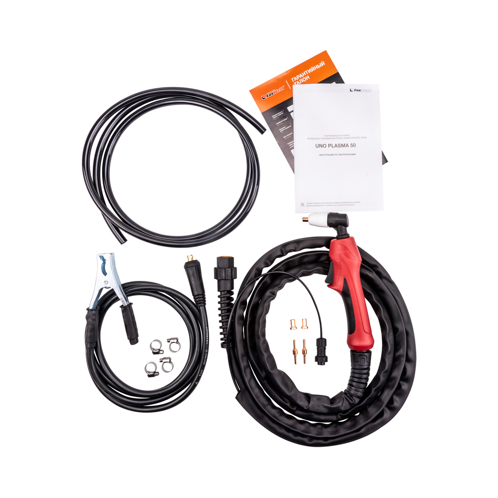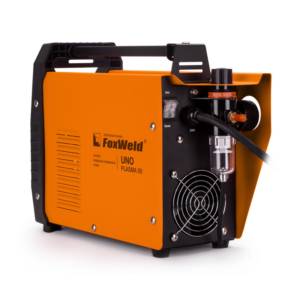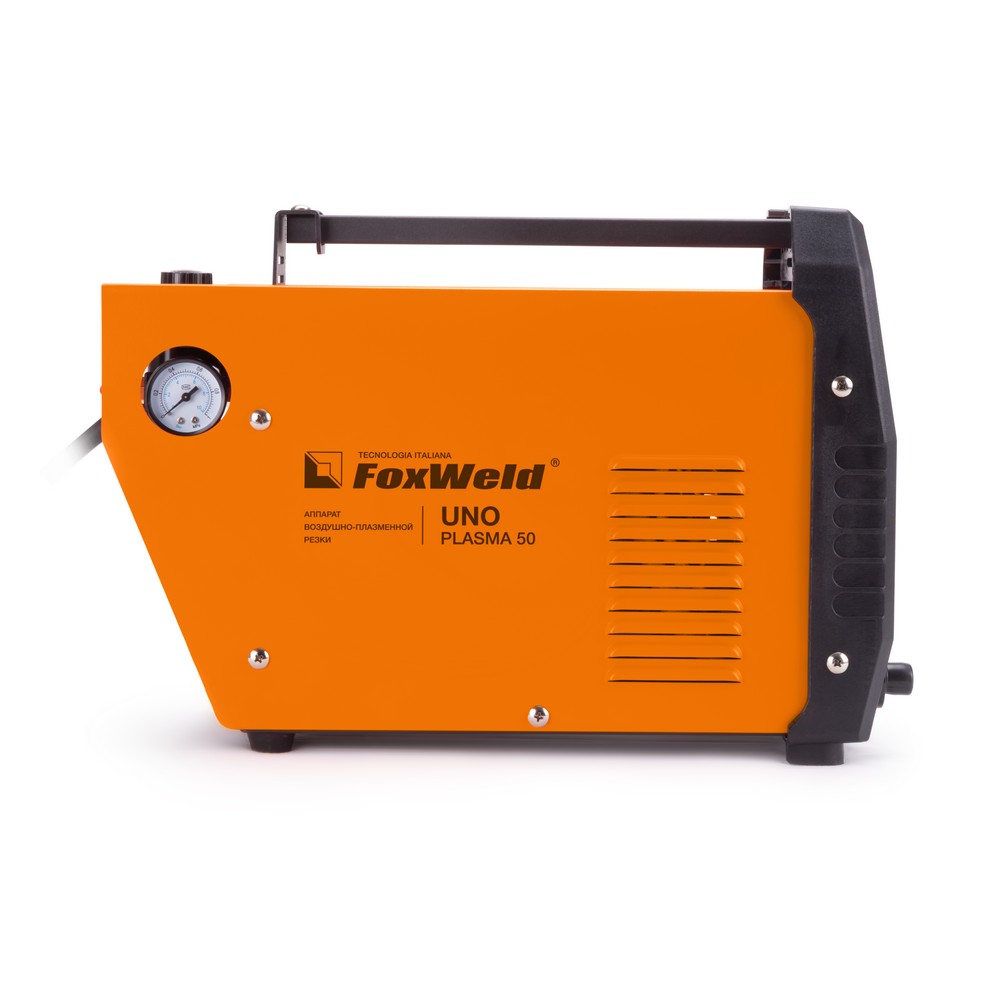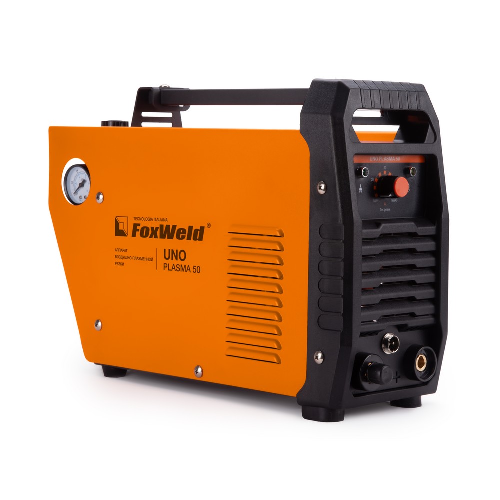 Аппарат плазменной резки FOXWELD UNO PLASMA 50 позволяет разрезать сталь толщиной до 18 мм. UNO PLASMA 50 подходит для резки алюминиевых сплавов, меди, цветных металлов, нержавеющей и углеродистой стали. Высокие динамические характеристики дуги, регулировка и точность установки тока, инверторная технология обеспечивают качество реза и экономию энергии. Встроенный манометр позволяет следить за значениями давления сжатого воздуха в процессе работы и при постпродувке плазмотрона. Небольшой вес и размеры аппарата, наличие ручки на корпусе идеально подходят для бытового и полупрофессионального использования.ФИГУРНАЯ РЕЗКАОсновное преимущество плазменной резки – возможность прорезать металл под разными углами, выполнять прямые и криволинейные резы и делать отверстия сложной формы. С помощью плазмотрона, выдающего струю плазмы, вырезать из металла и сплавов различные фигуры намного удобнее и быстрее по сравнению с УШМ.БЕЗОПАСНОСТЬ РАБОЧЕГО ПРОЦЕССАПлазменная резка намного безопаснее и экологичнее газовой резки. Источник питания, плазмотрон и компрессор (иногда встроенный в аппарат) – вот всё, что нужно для начала работы. Отсутствие взрывоопасности (никаких баллонов с газом) и загрязнения окружающей среды из-за метода сжигания топлива выгодно отличает плазменную резку от газовой.ВЫСОКАЯ ПРОИЗВОДИТЕЛЬНОСТЬПроцесс плазменной резки – это быстрый и простой способ резки металла и сплавов, который даёт качественный результат. Плазменная резка в несколько раз быстрее газовой. А качество реза достигается за счёт отсутствия тепловой деформации при выдувании излишек расплава и локального нагрева.ТОЛЩИНА РЕЗА ДО 18 ММБлагодаря высоким динамическим характеристикам дуги и стабильному току резки аппарат способен разрезать металл толщиной до 18 мм.НЕБОЛЬШОЙ ВЕСНебольшой вес и размеры аппарата плюс ручка на корпусе добавляют мобильности, компактности и идеально подходят для бытового и полупрофессионального использования.ПРЕИМУЩЕСТВА:Воздушное охлаждениеВстроенный манометрПродувка после резки для охлаждения плазмотронаНебольшой вес и размеры аппаратаЗащита от перегреваФУНКЦИОНАЛЬНЫЕ ОСОБЕННОСТИ:ВСТРОЕННЫЙ МАНОМЕТР: Встроенный манометр с индикатором на панели управления позволяет следить за значениями давления сжатого воздуха в процессе работы и при постпродувке плазмотрона.ЗАЩИТА ОТ ПЕРЕГРЕВА: Если аппарат работает непрерывно долгое время на большом токе, температура его внутренних компонентов может превысить допустимую. В этом случае загорается индикатор перегрева и включается режим термозащиты. При этом напряжение на выходных клеммах автоматически отключается, но вентилятор продолжает работать.ТАБЛИЦА ПОДБОРА КОМПРЕССОРОВ: В таблице ниже - рекомендации по подбору нужного компрессора.КОМПЛЕКТАЦИЯ: Аппарат плазменной резки UNO PLASMA 50 – 1 шт.; Плазмотрон PT-31, 3 м. – 1 шт.; Зажим для заземления с кабелем, 2 м. – 1 компл.; Рукав для подачи газа, 2 м. – 1 шт.; Узел подготовки воздуха (редуктор-осушитель) – 1 шт.; Комплект ЗИП – 1 шт.; Инструкция – 1 шт.; Гарантийный талон – 1 шт.
